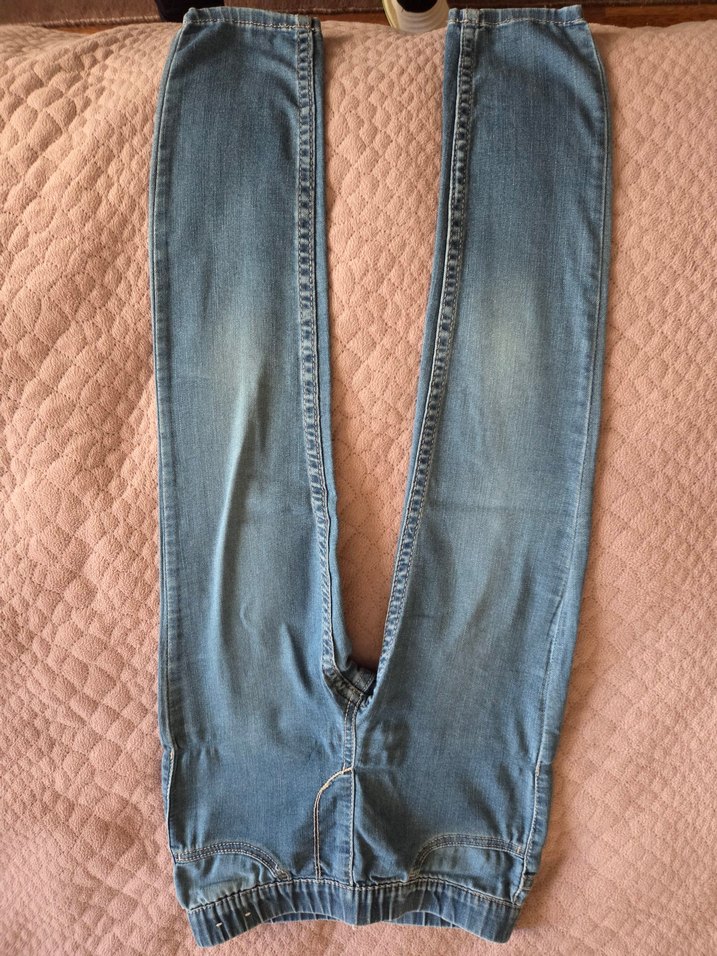 Mavi-gri tonlarda, elastik bel bantlı, düz kesim ve midi boy kot pantolonu, günlük rahat kullanım için uygundur.