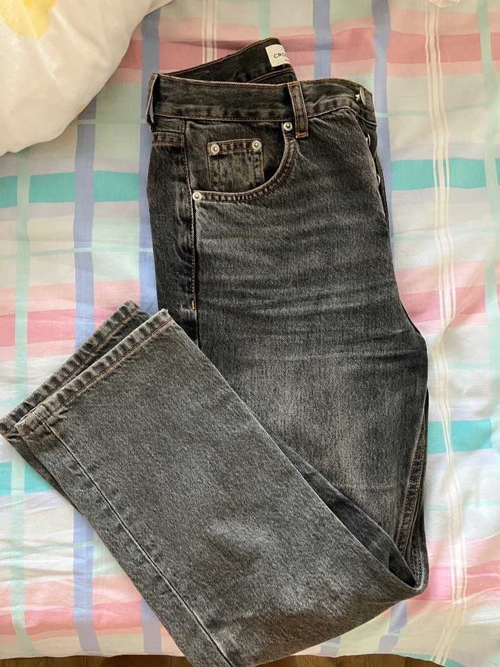 Gri denimden yapılmış, düğmeli ve hafif ağartmalı straight kesim kadın kot pantolon, günlük sokak stili için uygun.