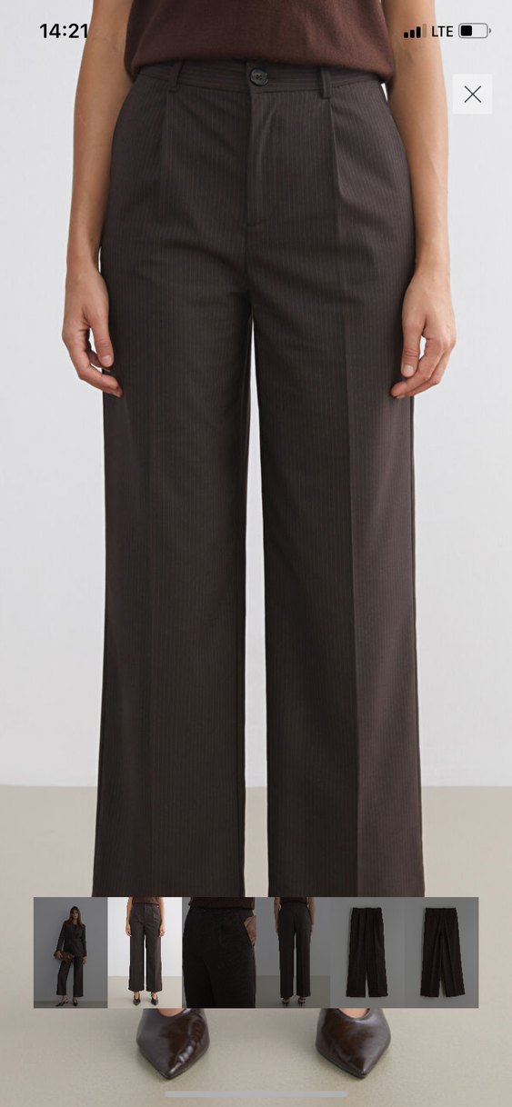 Kahverengi kumaştan, pilili detaylı, düz kesim midi boy kadın pantolon. Ofis için uygun, trend normcore tarzıyla rahat ve şık görünüyor. Bir kere giyildi paça boyu yapıldı