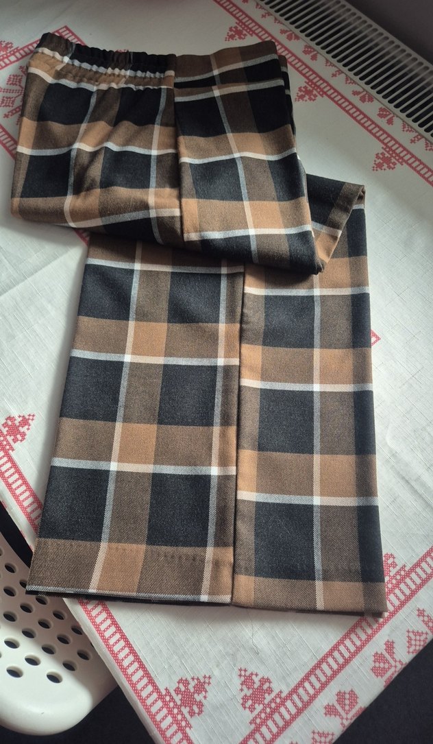 Kahverengi kareli kumaş capri pantolonlar, düz kesim ve pilili tasarıma sahip olup midi boyda, günlük kullanıma uygundur. Koyu tonları ve streetwear tarzı klasik bir hava katıyor.
