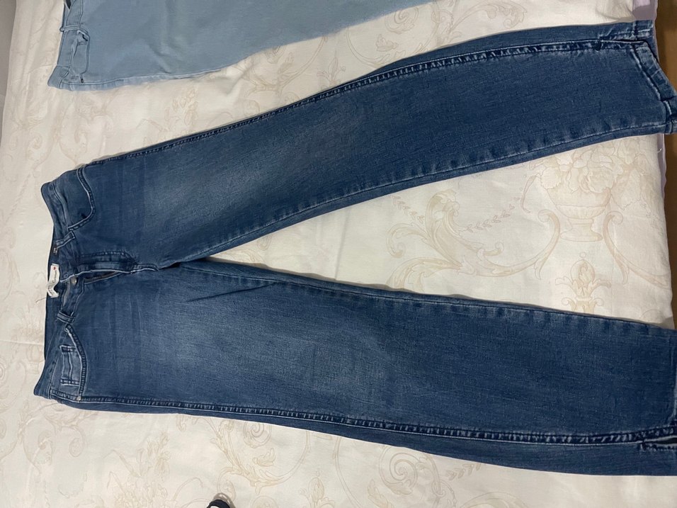 Mavi kot kumaştan, düz kesim ve yırtmaç detaylı kadın pantolonu. Normal midi boyda, sade ve günlük kullanıma uygun stil.