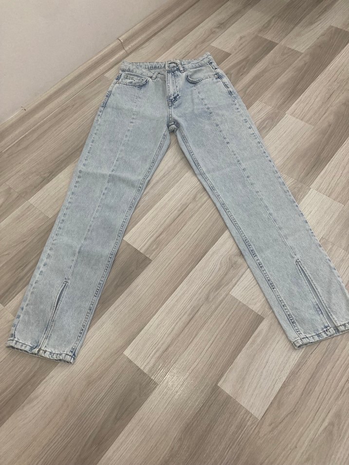 Düz kesim, yırtmaç detaylı midi uzunlukta, mavi tonlarında kot pantolon. Günlük sokak stili için uygundur.