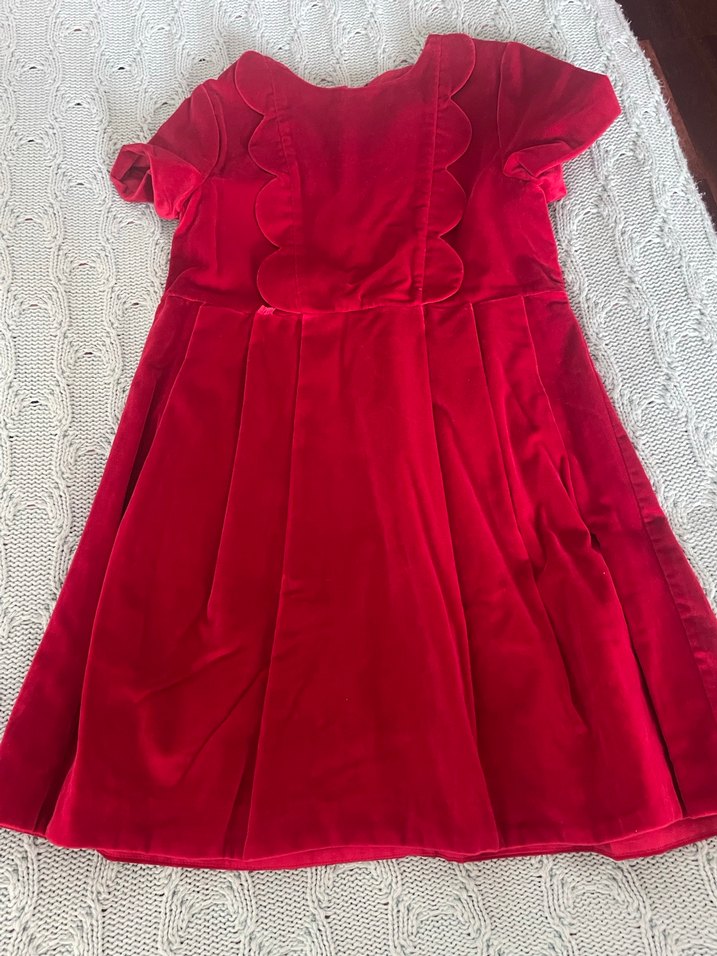 Parlak kırmızı, düz kadife kumaştan yapılmış, kısa kollu, fırfırlı detaylara sahip klasik ve gotik tarzda kız çocuk elbisesi. Jacadi 10 yaş