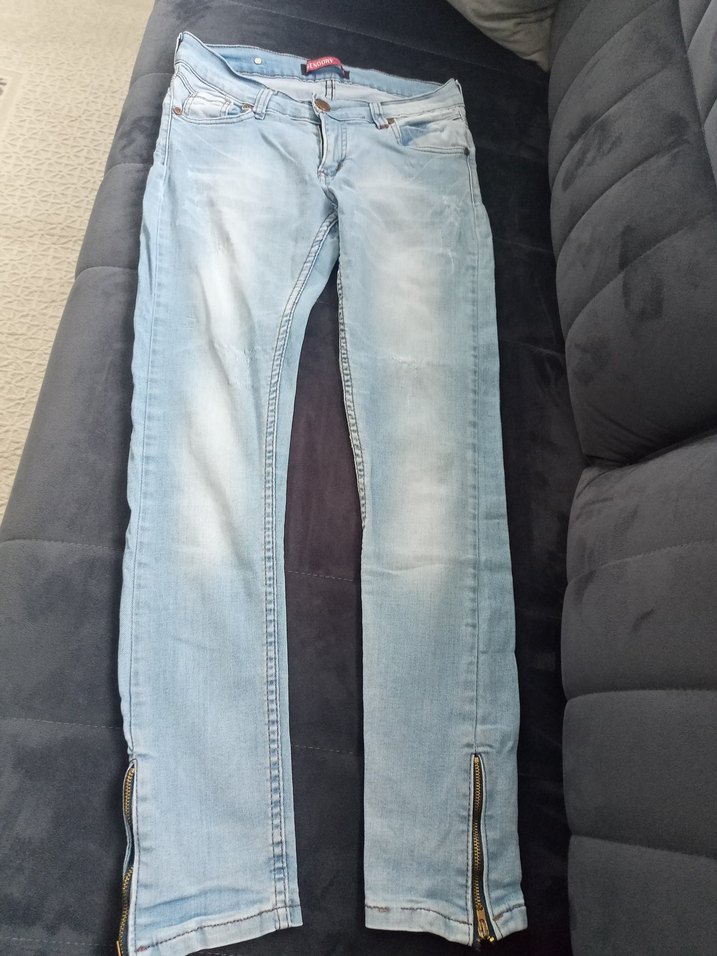 Mavi denimden yapılmış, düz ve normal boyda kadın pantolonu. Sokak tarzı için fermuarlı paçalar içerir, günlük kullanıma uygundur.