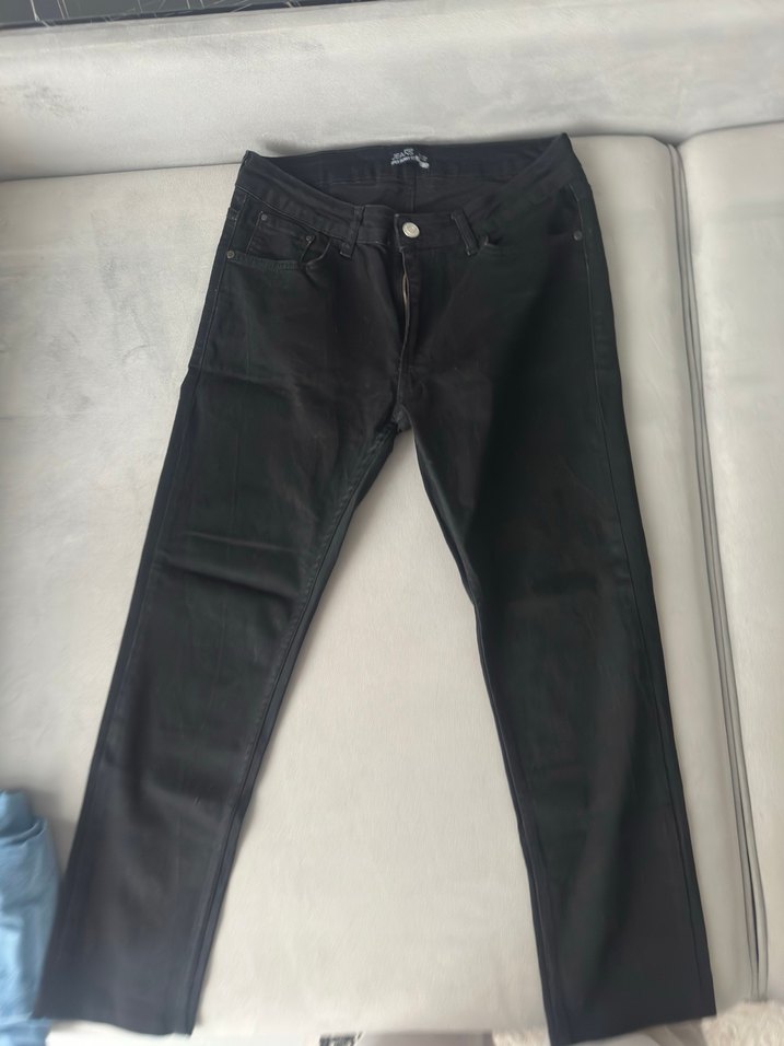 Düz siyah denim pantolon, normal boy ve regular fit kesimle günlük kullanıma uygundur. Sade tasarımıyla zahmetsiz şıklık sunar, casual sokak stiline uyumludur.