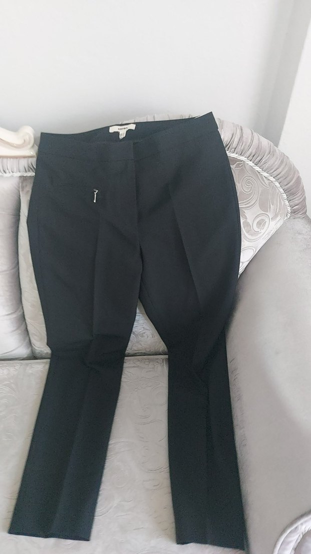 Düz siyah, normal boy midi uzunluğunda, regular fit kadın kumaş pantolon. Fermuarlı ve ofis kullanımı için uygun sade tasarım, sentetik kumaştan.