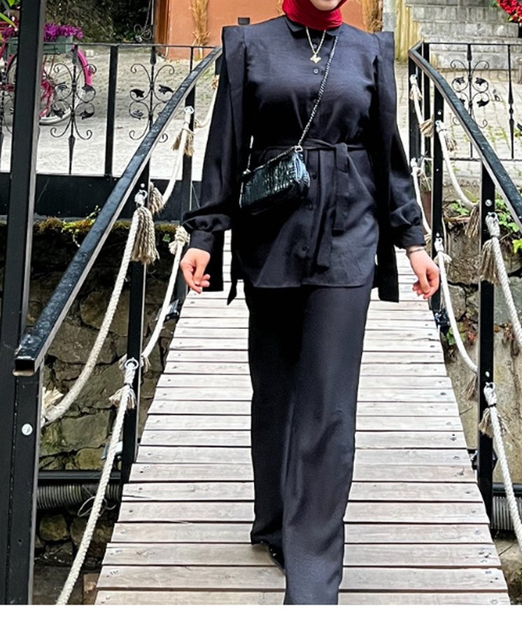 Düz Siyah Kemerli Kadın Uzun Takım Elbise