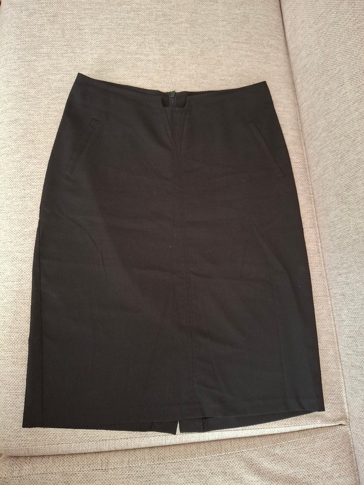 Düz siyah midi kalem etek, düz kesim ve düz desene sahiptir. Pürüzsüz sentetik kumaştan üretilmiş olup ofis için şık ve zahmetsiz bir görünüm sunar.