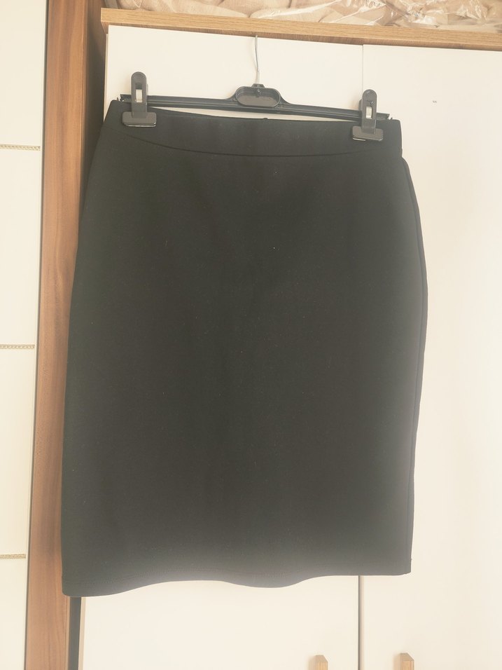 Düz siyah midi kalem etek, ofis ve iş ortamları için uygun, rahat kesim ve düz dokulu sentetik kumaştan yapılmıştır. Normcore tarzda, zahmetsiz şıklık sunar. uzunluğu 58 cm