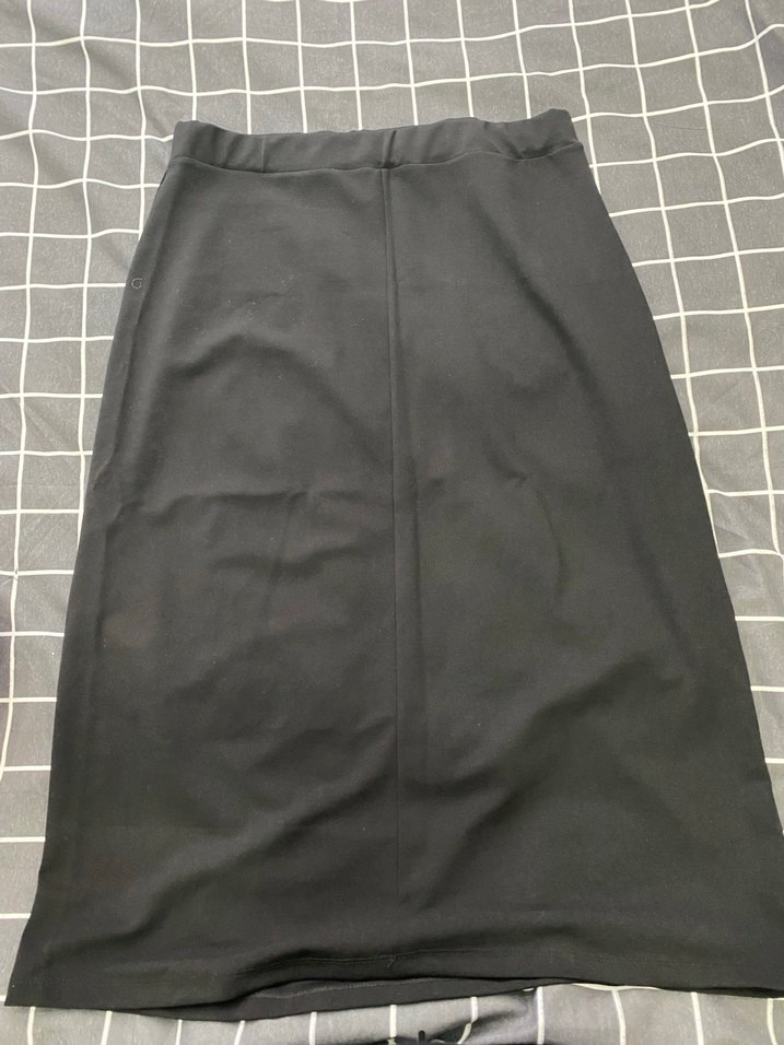 Düz siyah midi kalem etek, düz ve desen içermeyen, yumuşak sentetik kumaştan yapılmıştır. Ofis için uygundur. Büyük beden hiç kullanılmamış aldım dar geldi iade edemedim