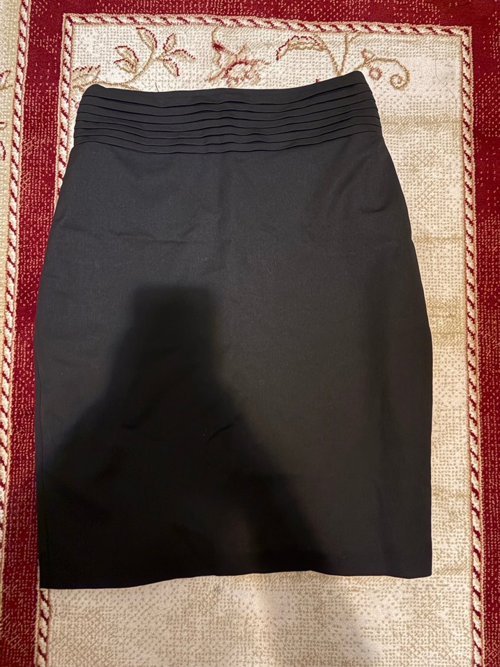 Düz siyah midi kalem etek, bel kısmında pile detaylarıyla ve vücuda oturan kesimiyle ofis ve goth tarzına uygundur. beli 35 cm boyu 58 cm
