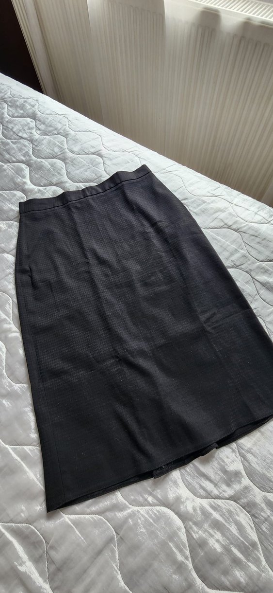 Düz siyah renkli, pilili detaylı ve midi boyda, sentetik kumaştan yapılmış kalem etek. Ofis kullanımı için uygundur.