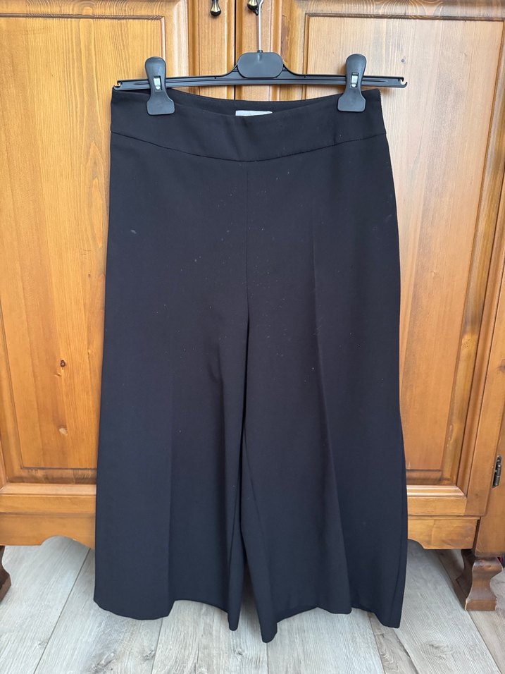 Ofis için uygun, düz siyah midi uzunlukta, boş kesim ve ve kumaş pantolon. Yumuşak sentetik kumaştan üretilmiştir.