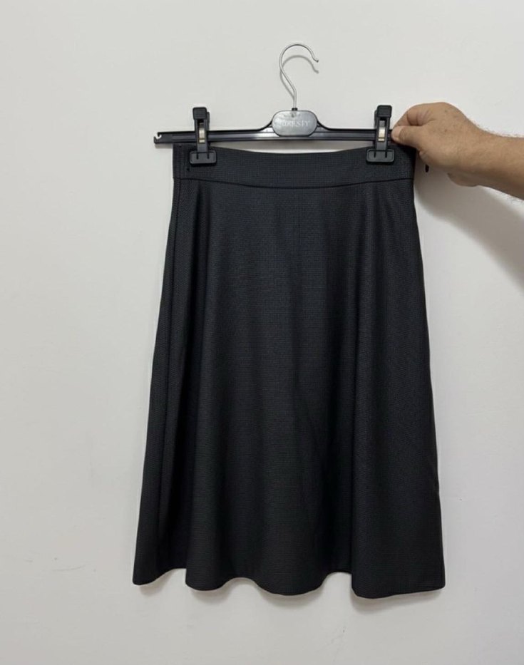 Siyah midi uzunlukta, pileli ve bol kesim kadın eteği, yumuşak sentetik kumaştan üretilmiştir. Minimalist ve goth tarzlara uygun, günlük kullanıma ideal.