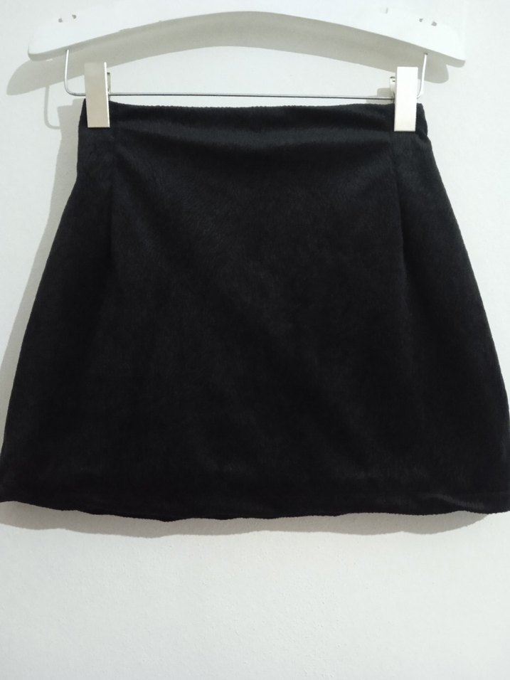 Siyah, düz ve vücuda oturan bu mini etek, sentetik kumaştan yapılmış olup minimalist goth tarzına uygundur. ✨