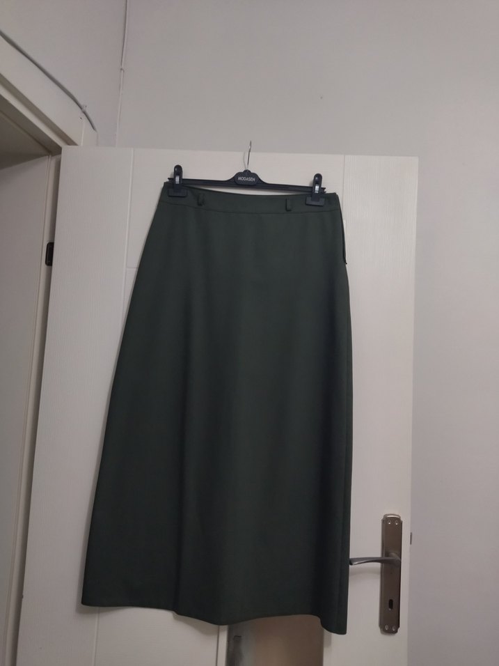 Bu siyah perde, düz ve desensiz tasarımıyla normcore tarzında sade ve şık bir görünüm sunar. 40 beden uyumlu haki renk etek