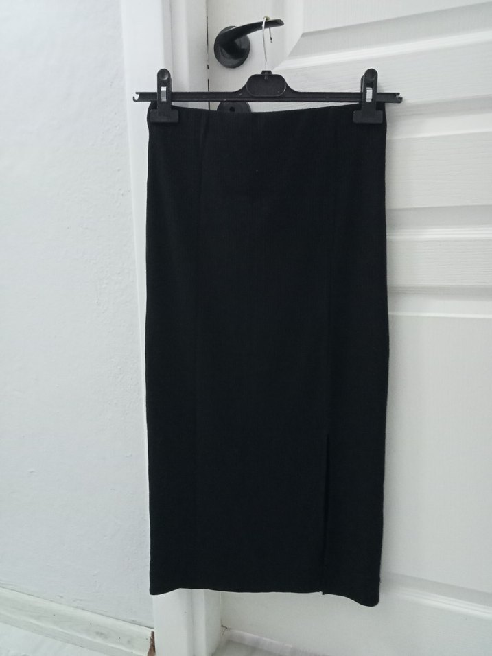 Düz siyah uzun ve vücuda oturan etek, yırtmaçlı ve düz sentetik kumaştan, ofis için minimalist gotik tarzda uygun.