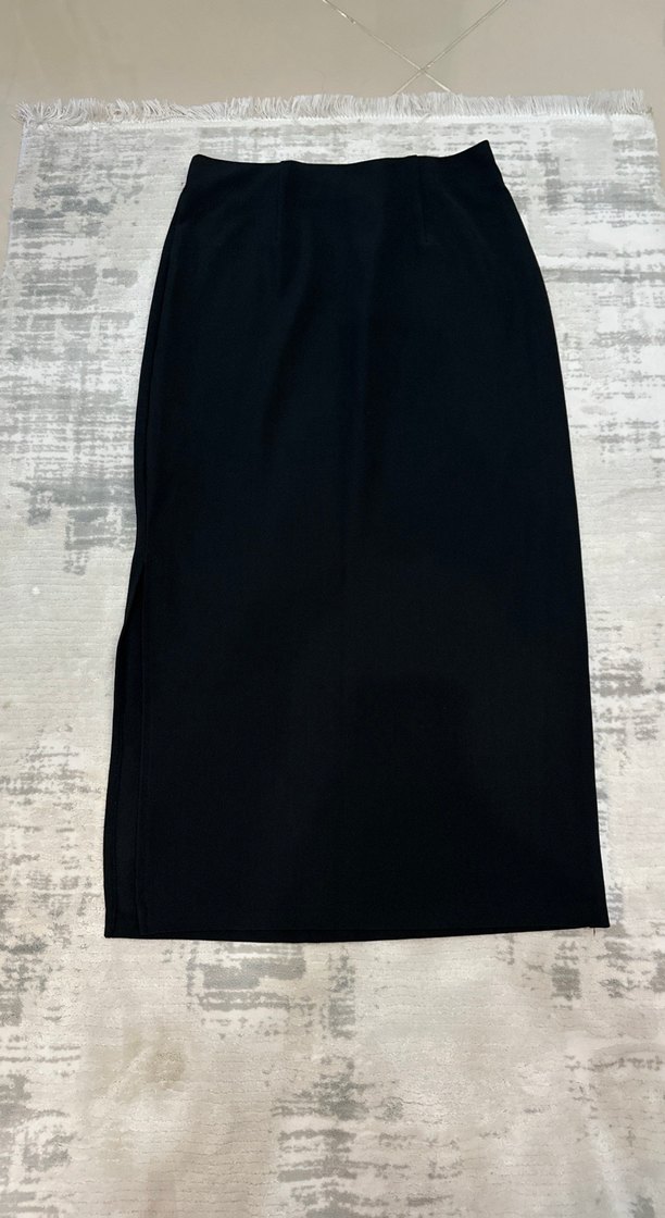Düz siyah, sentetik kumaştan yapılmış, vücuda oturan uzun kadın eteği, minimalist ve zahmetsiz şıklık sunar. Yandan yırtmaçşı