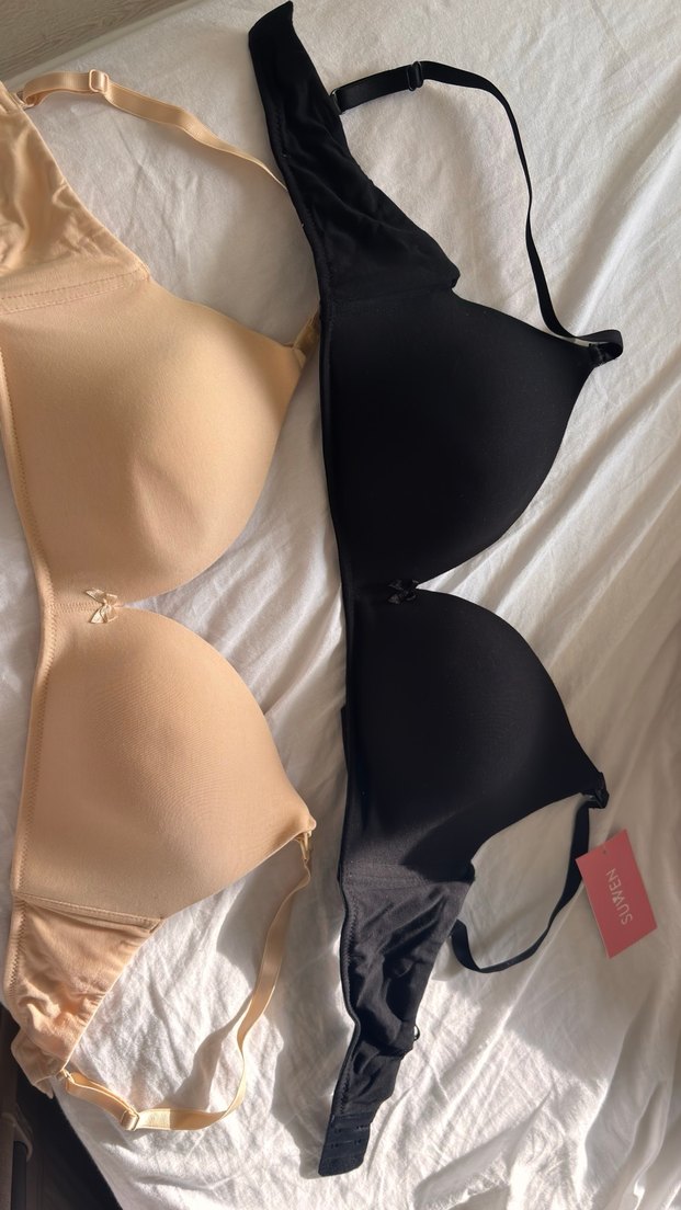 Minimalist tasarıma sahip, ten rengi ve siyah düz sütyenler. Normal uzunlukta, rahat ve sade normcore stilinde tasarlanmıştır. Markası Suwendir Emzirme sütyeni olarak geçer sıfırdır 90-B