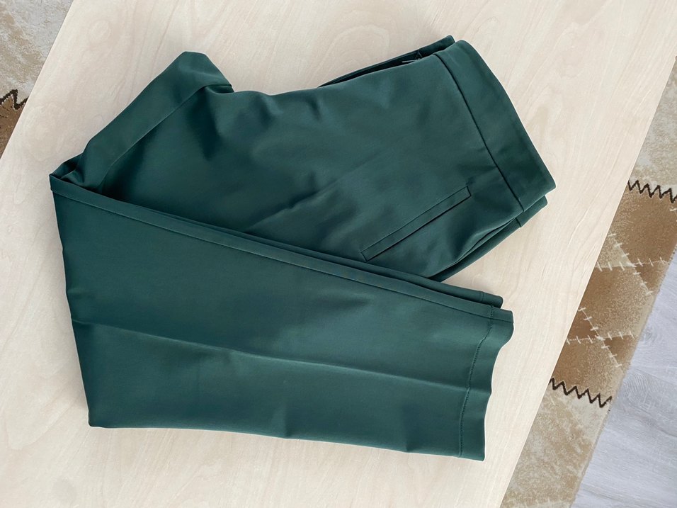 Düz, parlak yeşil renkte, normal boy midi kadın kumaş pantolon. Fermuar detaylı, sade ve minimalist ofis tarzı için uygundur.