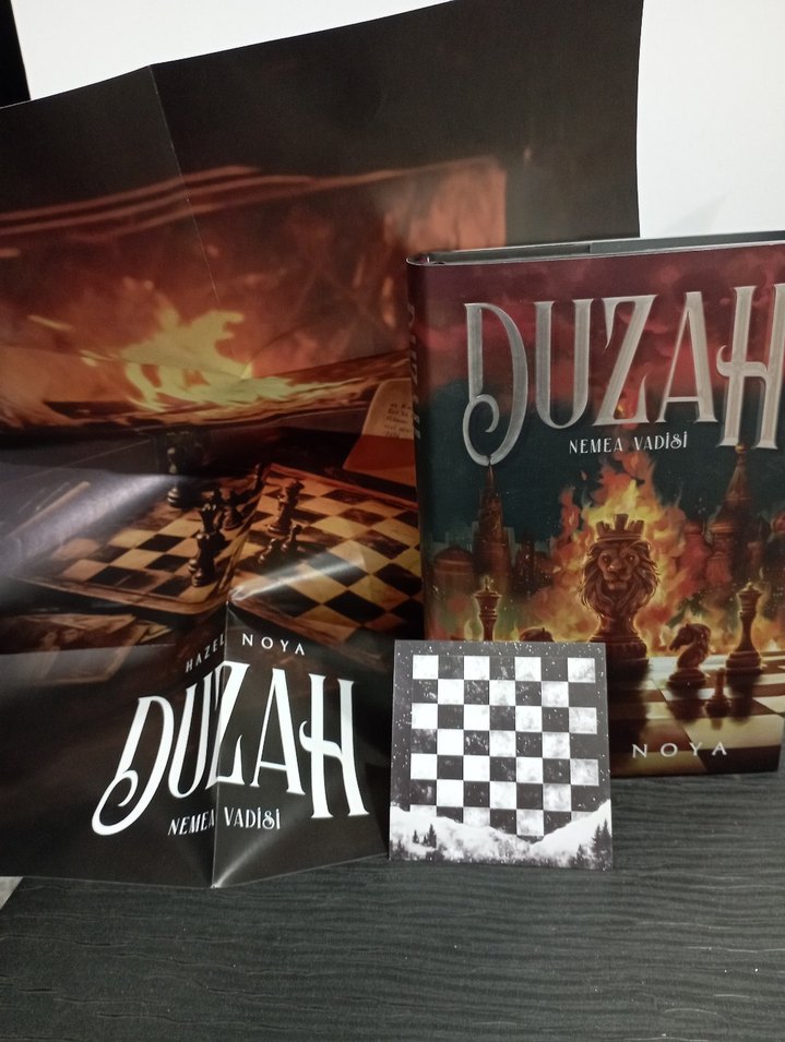 Duzah: Nemea Vadisi romanı, tematik satranç tahtası tasarımı ile birlikte poster ve küçük satranç tahtası görseli içerir.