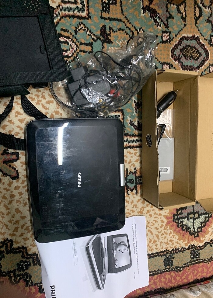 Philips markasının dvd oynatıcısı içerisindekiler: kullanım kılavuzu şarj adaptörü araba adaptörü av kablosu araba çantası dvd oynatıcı uzaktan kumanda bulunmaktadır. Sadece sesi az çıkmaktadır!!!!!