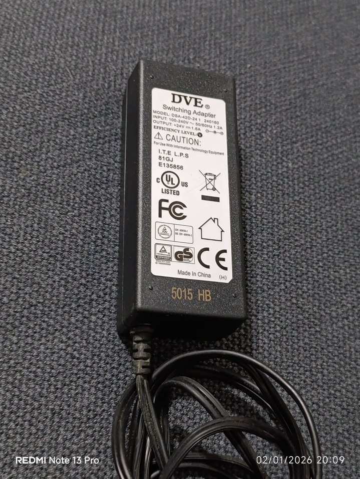 Gri DVE marka, 24V çıkış ve 1.6A akım sağlayan güç adaptörüdür. Güvenlik sertifikalarına sahiptir. ⚡