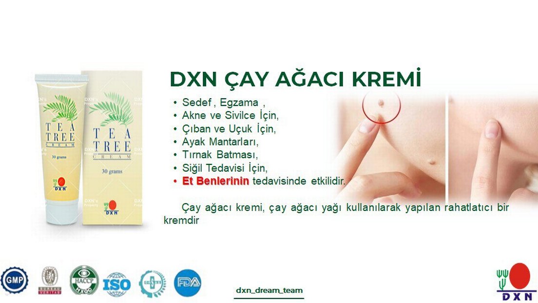 DXN Çay Ağacı Kremi, sedef, egzama, akne, çıban, ayak mantarları, tırnak batması ve siğil tedavisinde etkili doğal bir kremdir.