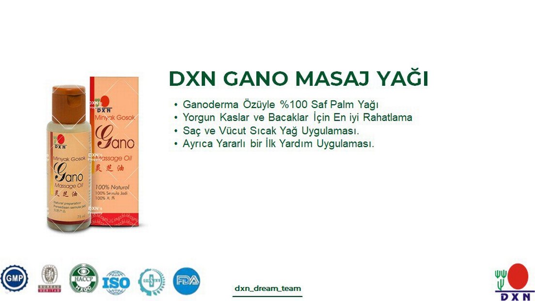 DXN Gano Masaj, Ganoderma özüyle %100 saf palm yağıdır. Yorgun kaslar ve bacaklar için sıcak yağ uygulaması olarak kullanılır ve saç ile vücut için faydalıdır. İlk yardım uygulamasıdır.