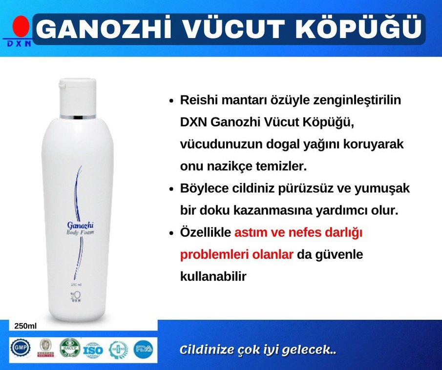Reishi mantarı özüyle zenginleştirilmiş DXN Ganozhi Vücut Köpüğü, cildinizin doğal yağını koruyarak nazikçe temizler. Cildinizin pürüzsüz ve dokulu olmasına yardımcı olur. Astım ve nefes darlığı problemi olanlar da güvenle kullanabilir.