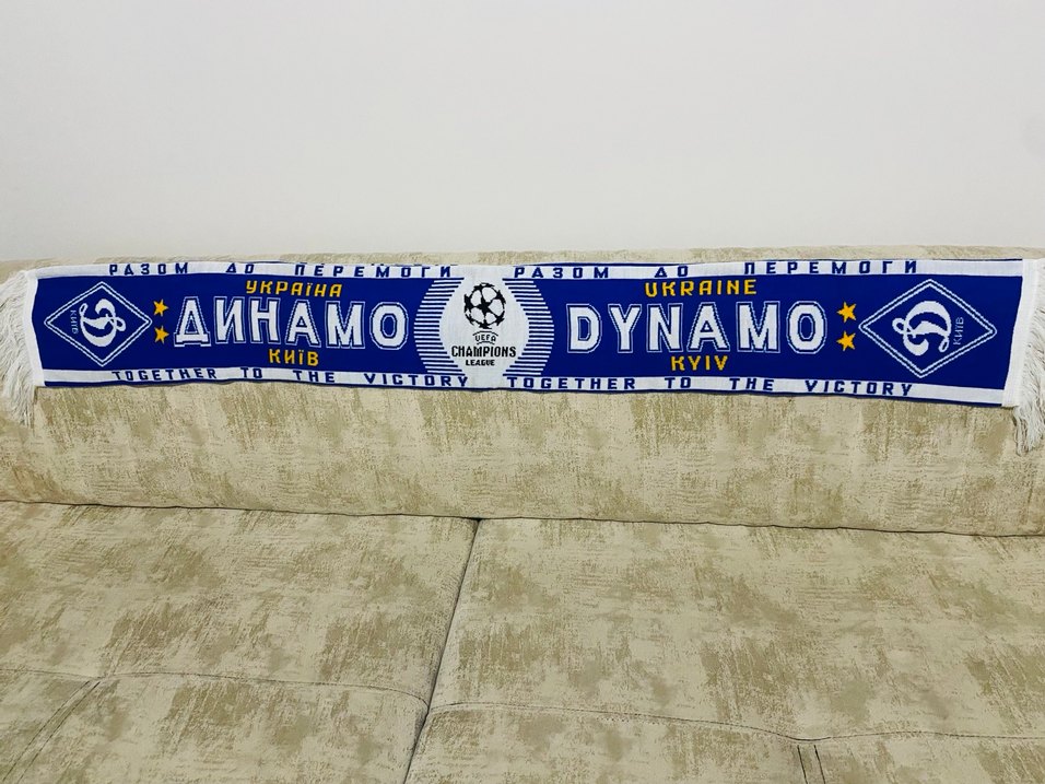 Beyaz ve gri renklerde, Dynamo Kyiv ve Şampiyonlar Ligi logoları ile baskılı, Ukraynaca ve İngilizce yazılı havlu. ⚽