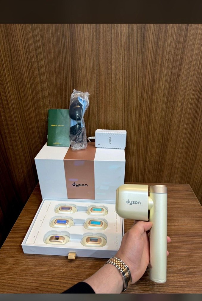 Dyson açık haki renk lazer epilasyon cihazı, çoklu uygulama başlıkları ve koruyucu gözlük ile birlikte gelir. Çeşitli epilasyon seçenekleri sunar.