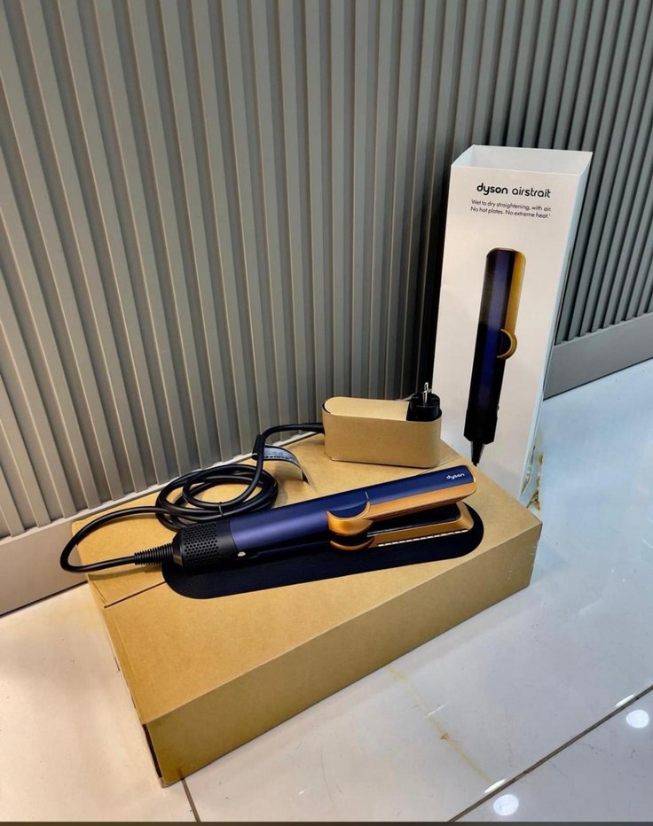 Dyson Airsroit saç düzleştirici koyu mavi renkte ve şık tasarıma sahiptir. Güç kablosu ve kullanım kolaylığı için stand ile birlikte gelir. Saçları düzgünleştirmek için uygundur.