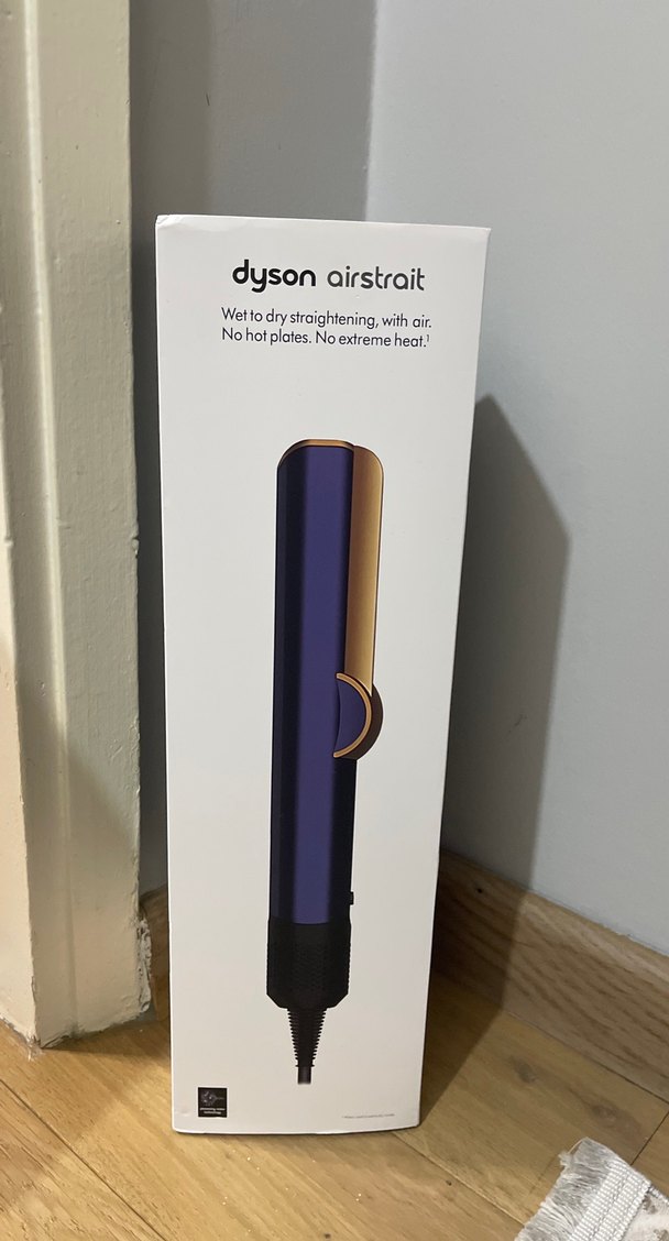 Dyson Airstrait mor renkli saç düzleştirici, sıcak plaka olmadan ve aşırı ısı vermeden havayla ıslak saçları kurutup düzleştirir.