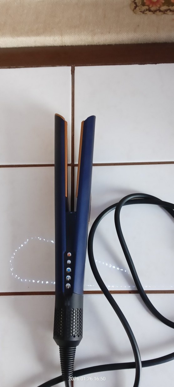Koyu mavi renkli saç düzleştirici, düğmeli çoklu ısı ayarlarına sahip ve uzun kablosu ile kullanım kolaylığı sağlar. Dyson Airstrait™ saç düzleştirici pabuçlar da birinin muhafaza plastiği yok kullanıms engel değil.