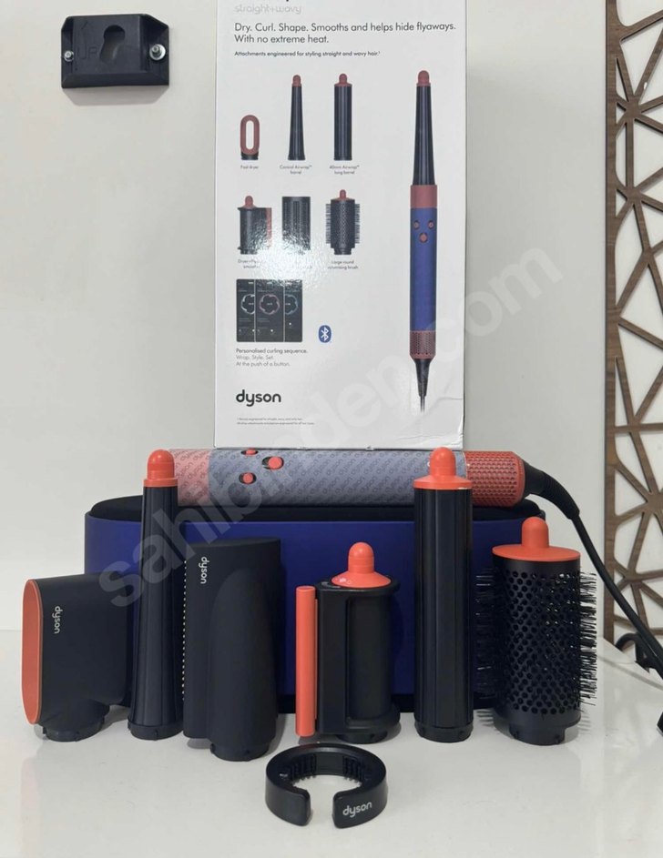 Dyson'un koyu mavi çok fonksiyonlu saç şekillendiricisi, saçları kurutma, şekillendirme ve düzleştirme için çeşitli aparatlarla birlikte gelir. Isı yok.