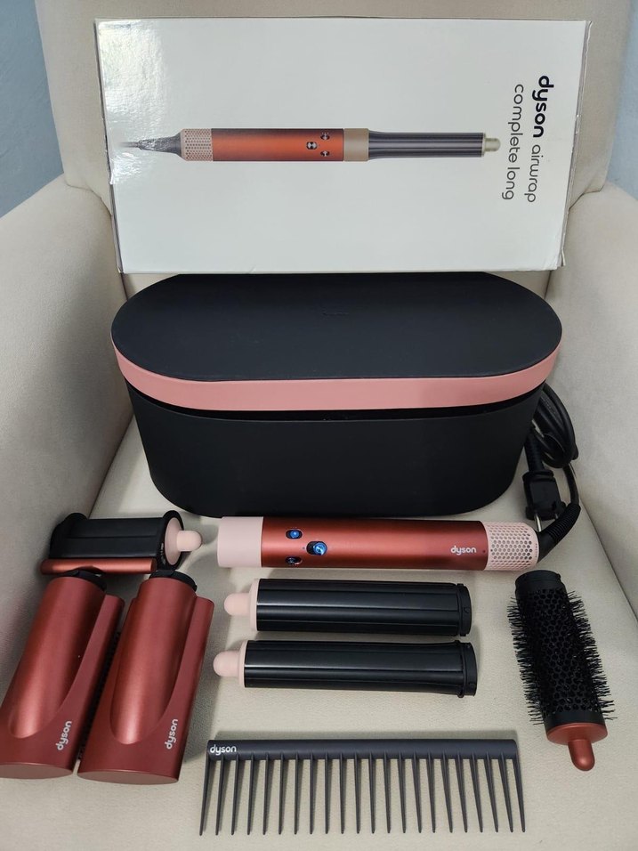 Dyson Airwrap saç şekillendirici seti, çeşitli başlıklarla çok yönlü kullanım sağlar. Koyu pembe ve siyah renklerde, saklama kutusuyla birlikte gelir. ♀️kapalı kuru jelatinli şekilde gelir