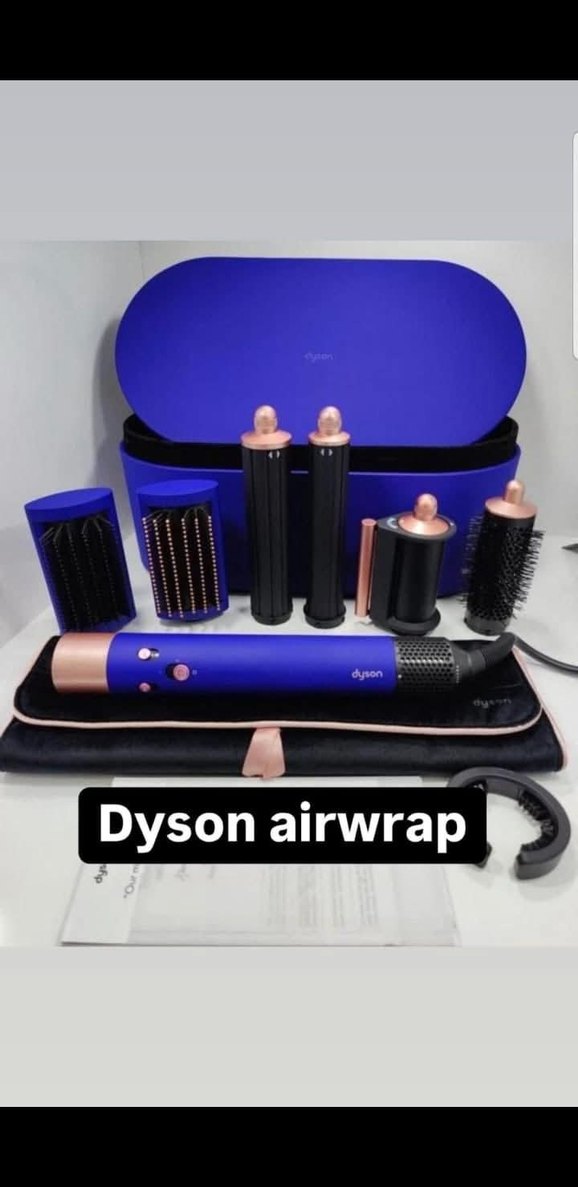 Dyson Airwrap koyu mavi saç şekillendirici, çoklu aparatlar ve şık bir kutu ile gelir. Farklı saç stilleri için uygundur. ♀️