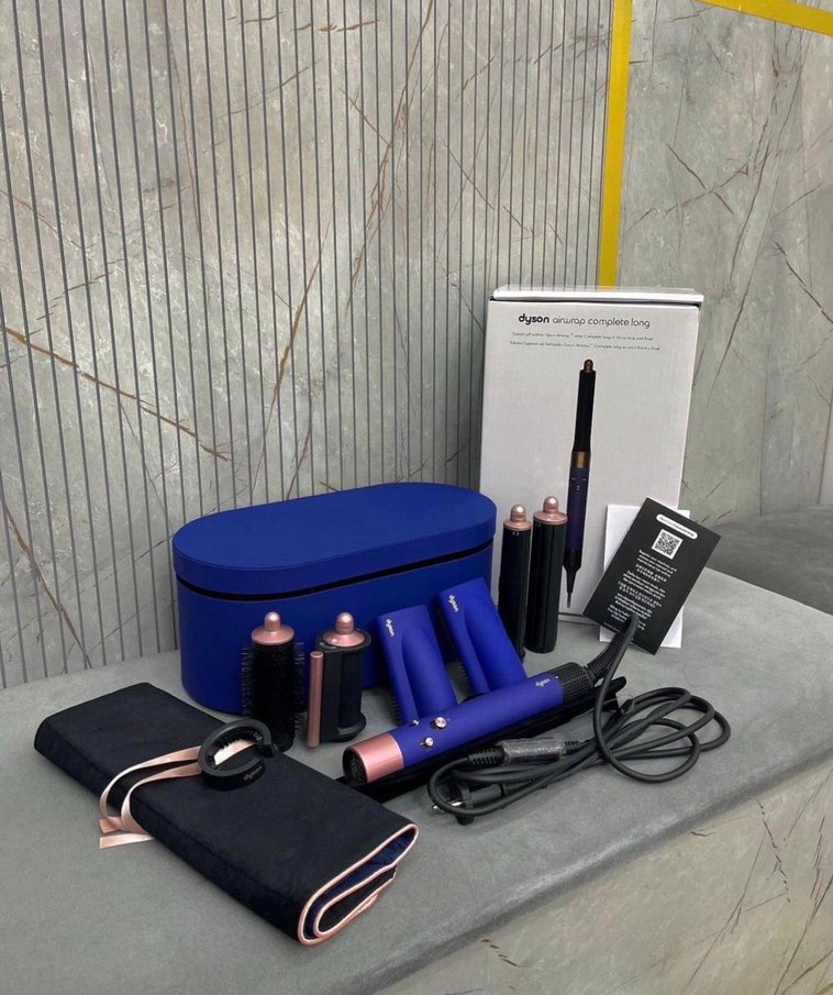 Koyu mavi Dyson Airwrap saç şekillendirici, farklı saç stilleri için çoklu başlıklar ve saklama kutusu ile birlikte gelir. Farklı fırçalar ve maşalar içerir.