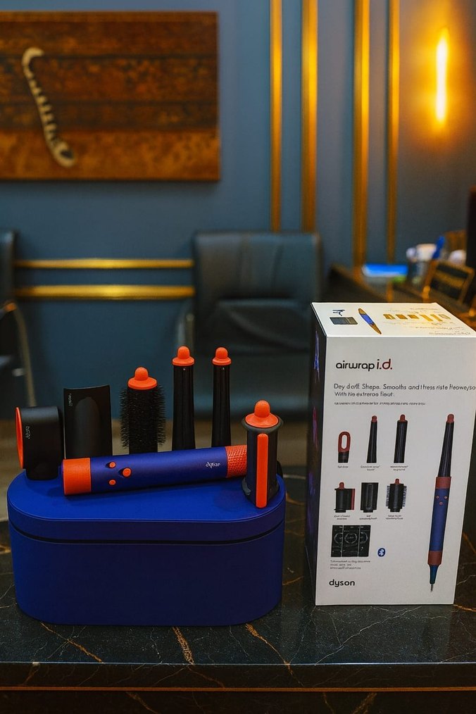 Dyson Airwrap saç şekillendirici, koyu mavi renkte, saç kurutma, kıvırma ve düzleştirme için çeşitli başlıklara sahiptir. Saklama kutusu ve gelişmiş hava akımı teknolojisi içerir. ♀️
