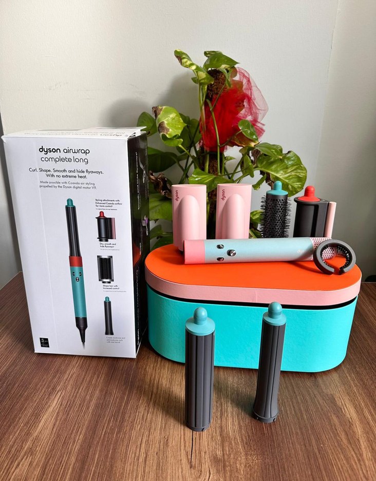 Dyson Airwrap Complete Long saç şekillendirici seti, pastel pembe renkte, bukle yapma, şekillendirme, düzleştirme ve kurutma için çeşitli başlıklar içerir. Turkuaz ve turuncu saklama kutusu ile birlikte.