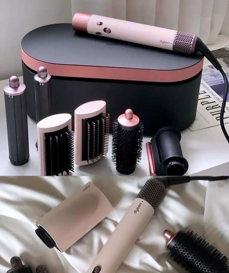 Dyson Airwrap saç şekillendirici seti, farklı fırça başlıkları ve şık pembe-koyu renkli saklama kutusuyla çeşitli saç şekillendirme seçenekleri sunar. ♀️