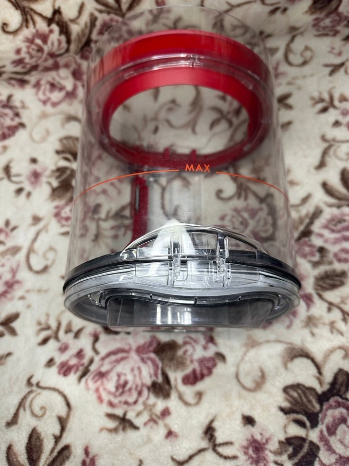 Kırmızı ve gri renkte, şeffaf gövdeli ve maksimum dolum çizgili süpürge toz haznesi.