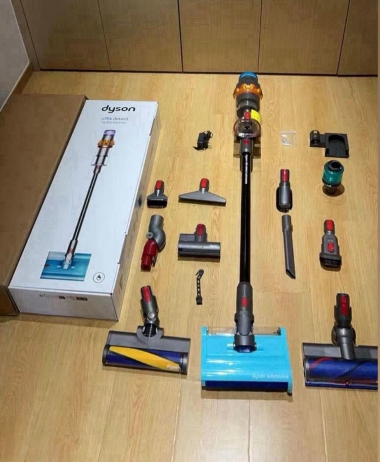 Koyu renkli, çok parçalı Dyson kablosuz elektrikli süpürge, farklı yüzeyler için çeşitli başlık ve aksesuarlarla birlikte gelir.