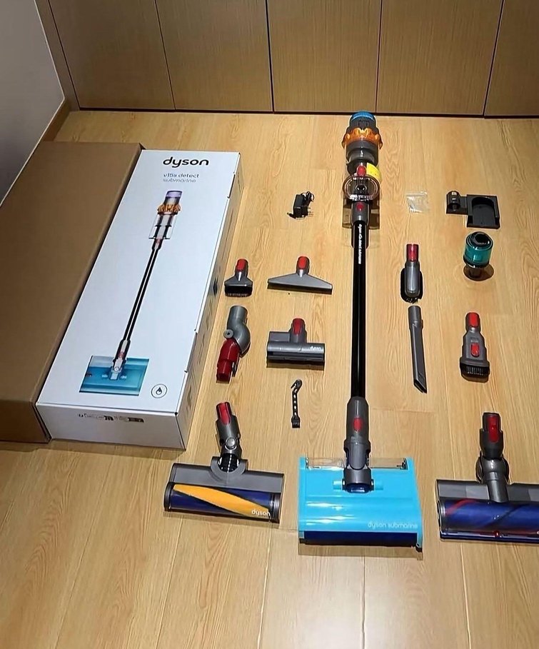 Dyson kablosuz elektrikli süpürge, çeşitli temizlik ihtiyaçları için çoklu başlıklarla birlikte gelir. Koyu çok renkli tasarıma sahiptir.