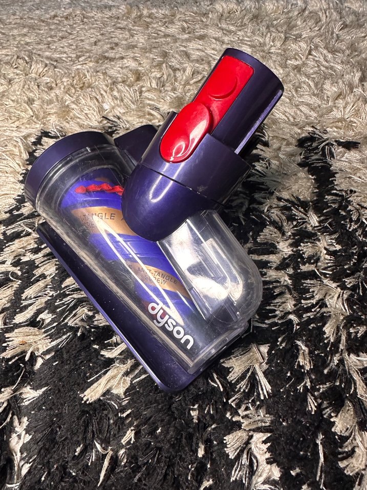 Şeffaf toz hazneli, kırmızı düğmeli koyu mor Dyson elektrikli süpürge başlığı. Etkili temizlik için tasarlanmıştır.