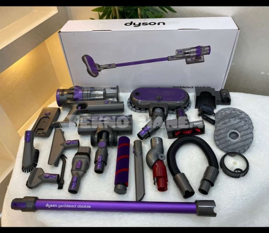 Dyson Gen5Detect Absolute mor elektrikli süpürge, çoklu başlıklarla çeşitli temizlik seçenekleri sunar. Gelişmiş toz algılama teknolojisine sahiptir.
