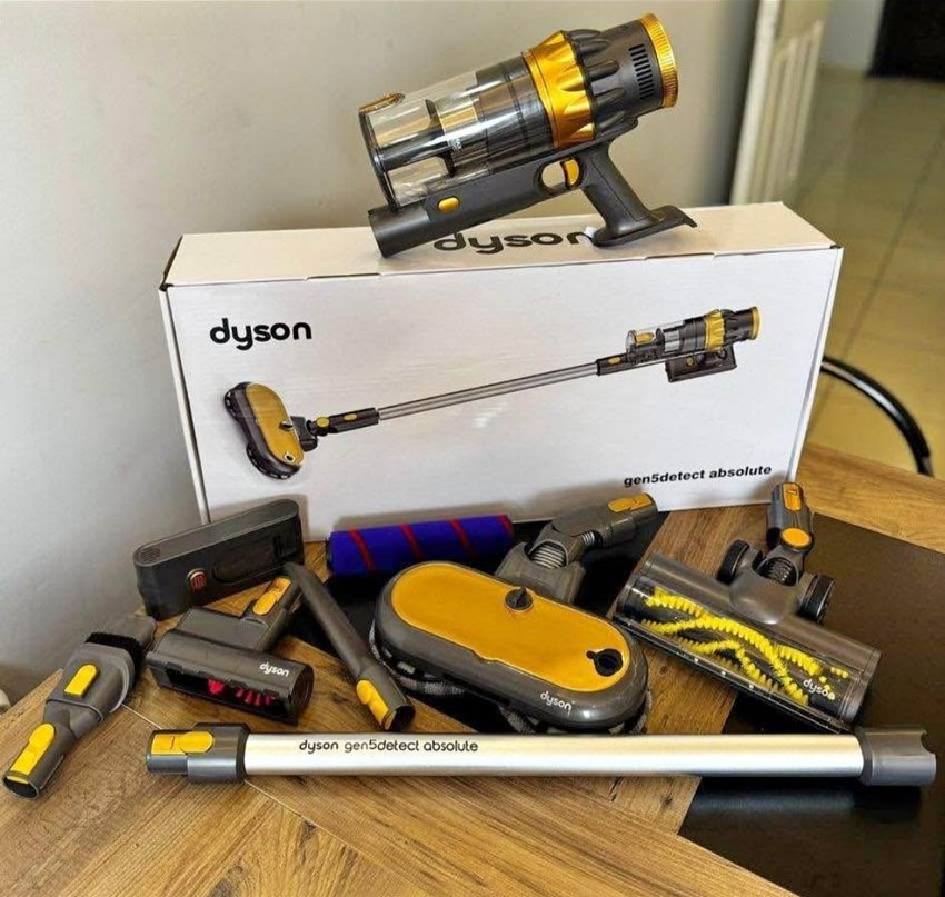 Dyson Gen5detect Absolute kablosuz süpürge, koyu sarı renkte ve çeşitli başlıklarla birlikte geliyor. Çok yönlü temizlik sağlar.