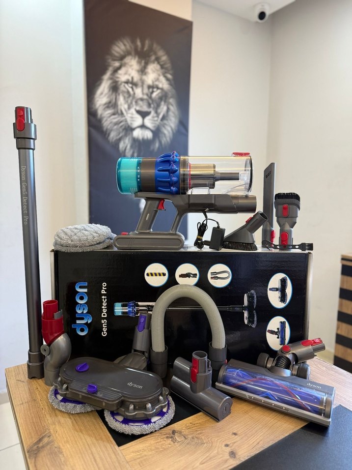 Dyson marka koyu gri renkli elektrikli süpürge, çoklu başlıklar ve mop aparatı ile detaylı temizlik sağlar. Üzerinde 'uoship' yazısı bulunur.