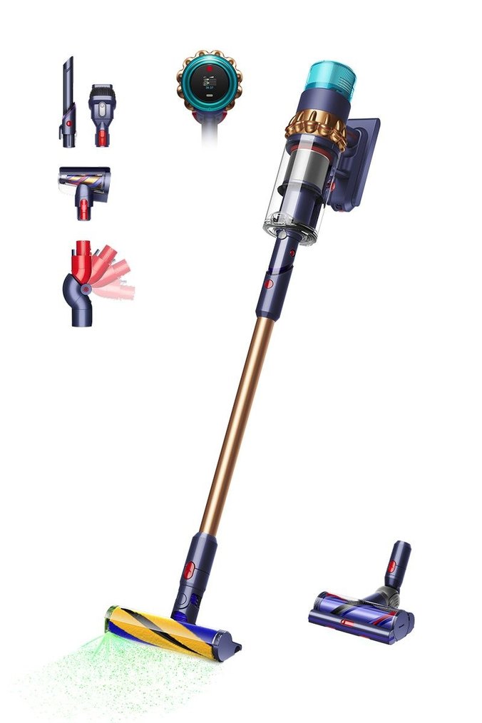 Dyson kablosuz elektrikli süpürge, koyu altın renk tasarımı ve çoklu aparatlarıyla çeşitli temizlikler için uygundur. Dijital ekran ve esnek başlıklar içerir.